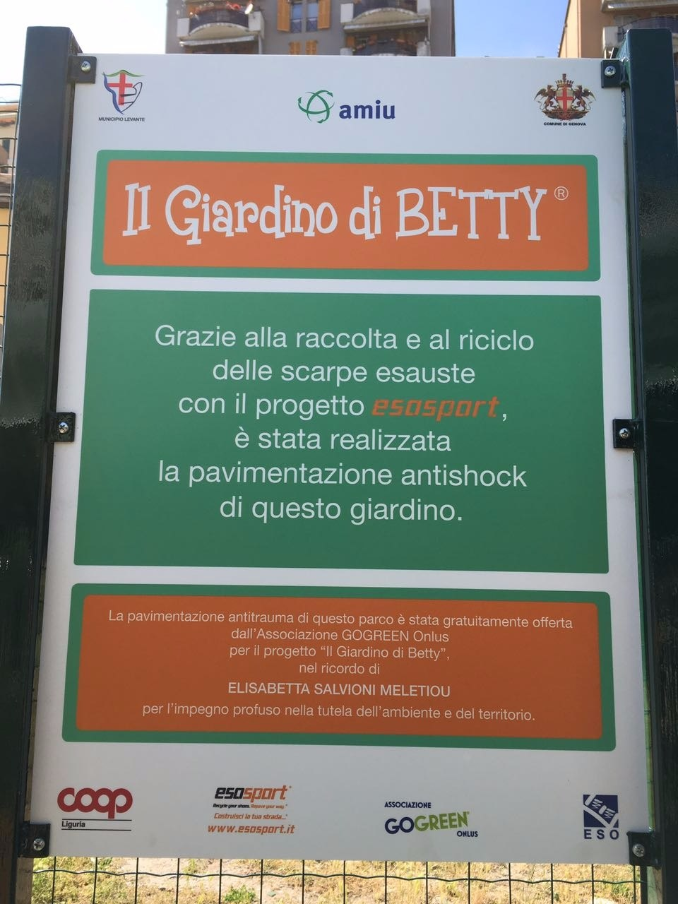 Per Genova si tratta del 6° Giardino di Betty, un altro esempio concreto di economia circolare: le scarpe esauste conferite nei contenitori dedicati, evitando di finire nella raccolta indifferenziata, tornano a vantaggio della comunità con la realizzazione della pavimentazione per il parco giochi del quartiere.